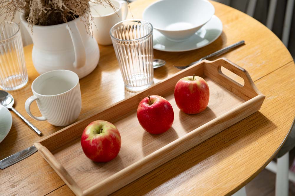 - Dining area: with table; two chairs; next to the French doors leading out to the patio area.