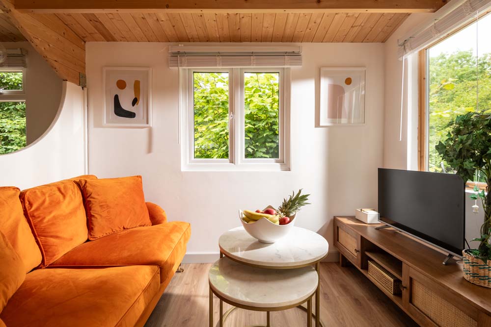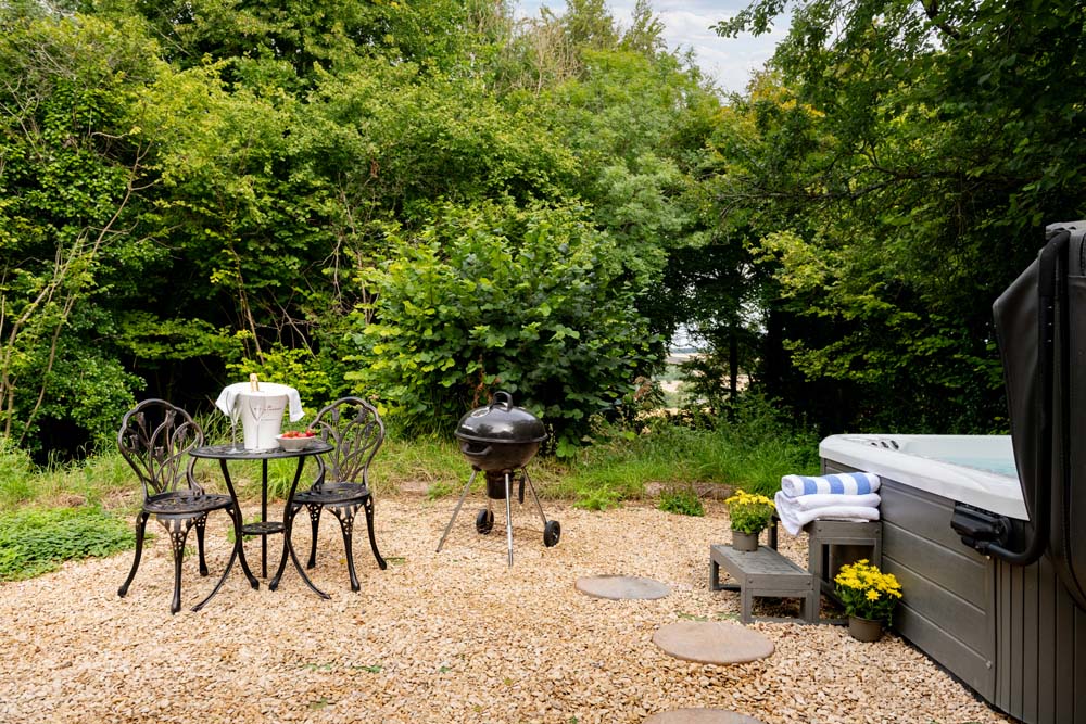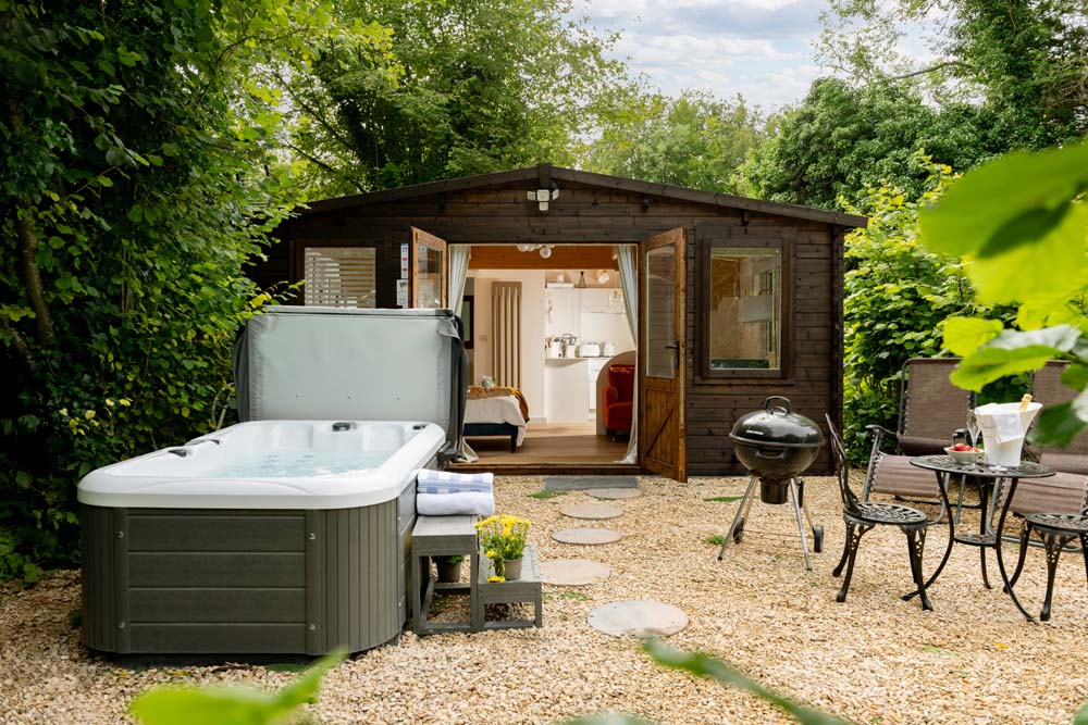 Inside, get cosy in front of the TV on the squishy, velvet sofa. Or snuggle up in the comfy double bed. You can admire the views of the trees from the windows or throw open the doors that lead to the beautiful, secluded garden to get a better view. Outside is where you’ll also find the hot tub.