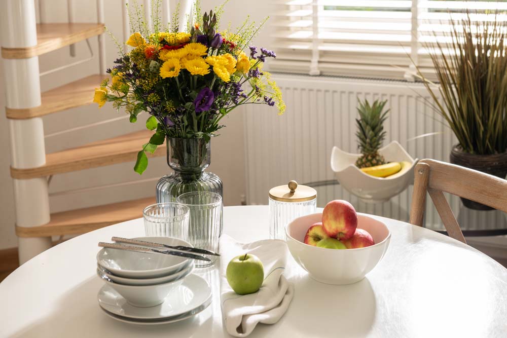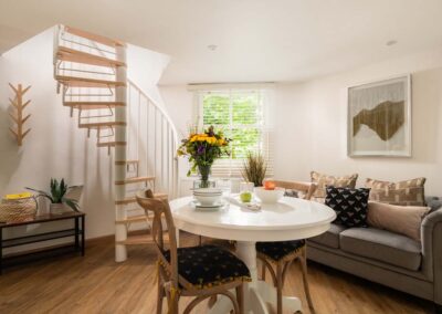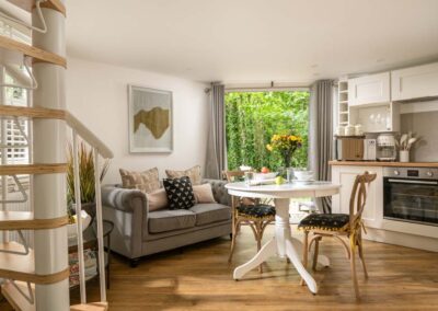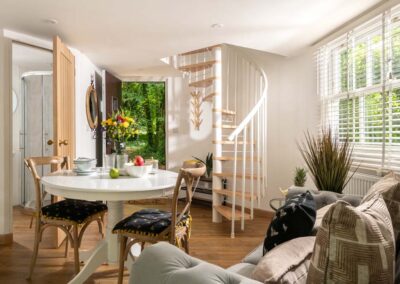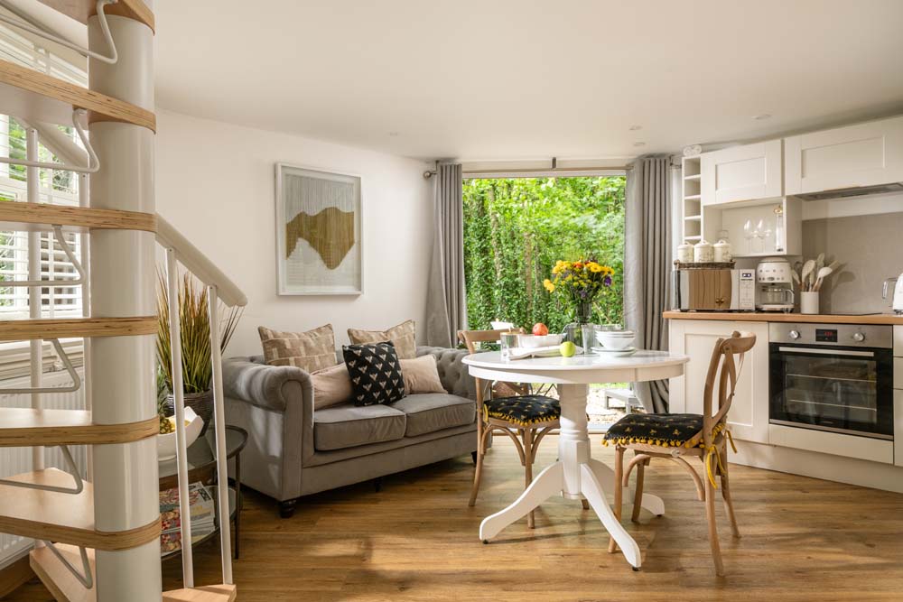 Step through the front door to the gorgeous open-plan living space. This light-filled room houses the kitchen, dining area and living room. It has French doors leading out to the garden, as well as a door to the bathroom, and a spiral staircase that leads upstairs to the bedroom.