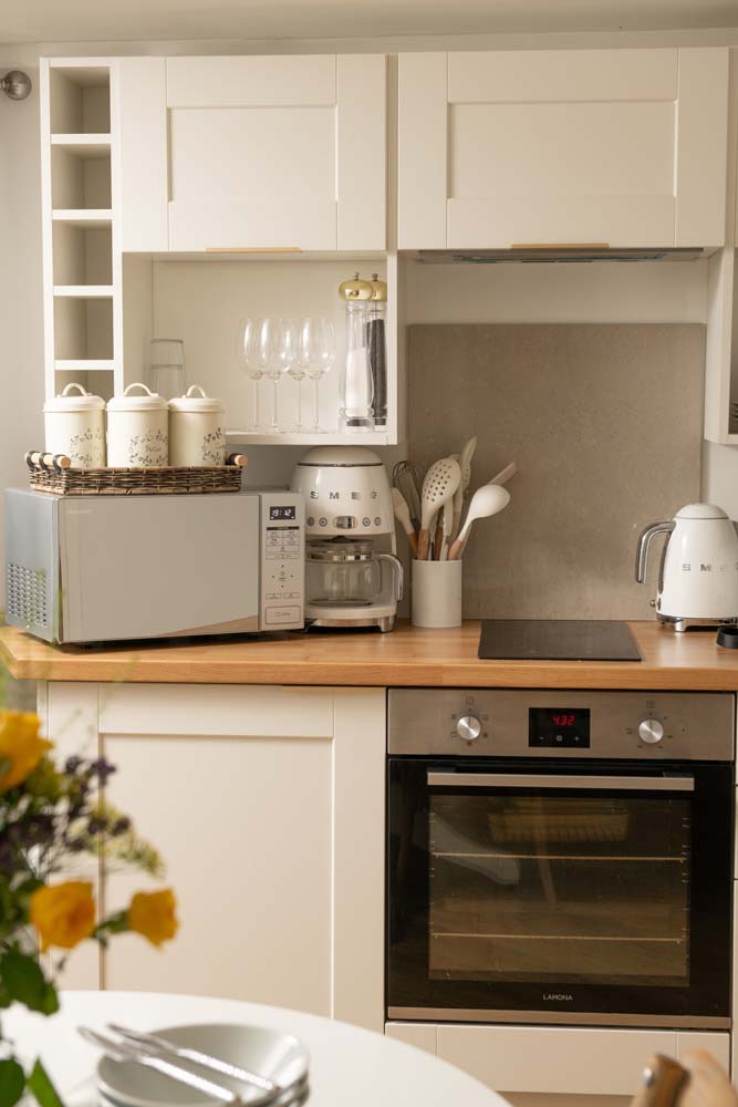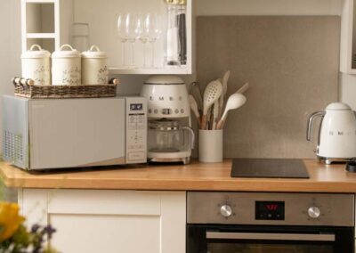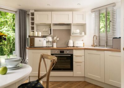 Our tree house holiday rental in Dorset comes with a modern kitchen, luxurious bedding, fine towels, heating, Wi-Fi, and a hot tub.