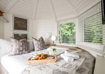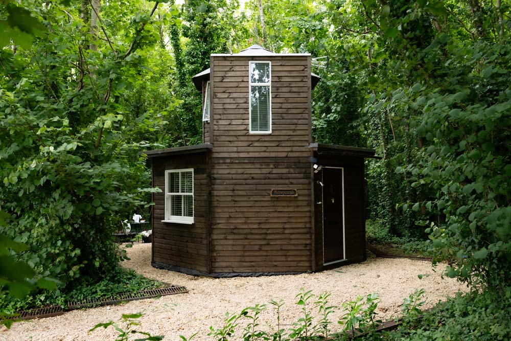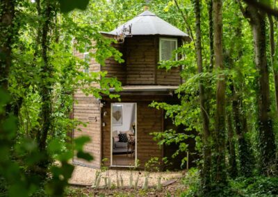 Our Dorset tree house, the Honeycomb, is a split-level hideaway with one double bed, making it ideal for couples or a small group. Because of the spiral staircase and overlook perch, it’s not ideal for small children. Our cottages are better suited for families with children.